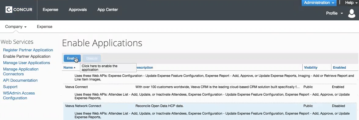 The Veeva Network Connect app is now enabled in your SAP Concur instance.