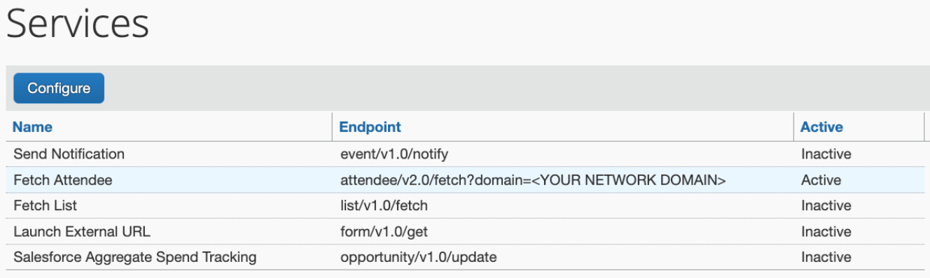 - On the Application Connector Registration page, in the Services section, select the Fetch Attendee row and click Configure.