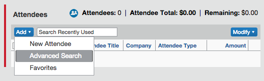 - In the Attendees section of the expense, select Advanced Search from the Add drop-down list.