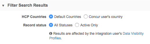 Veeva OpenData search results are dependent on the Integration user's data visibility profiles and permissions; however, they can be configured for the Concur user's country and language settings.