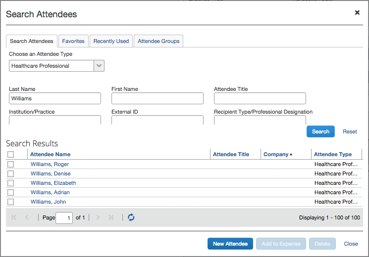- From the Search Attendees dialog, verify that Choose Attendee Type is set to Healthcare Professional; this ensures that Concur will only search Network data.