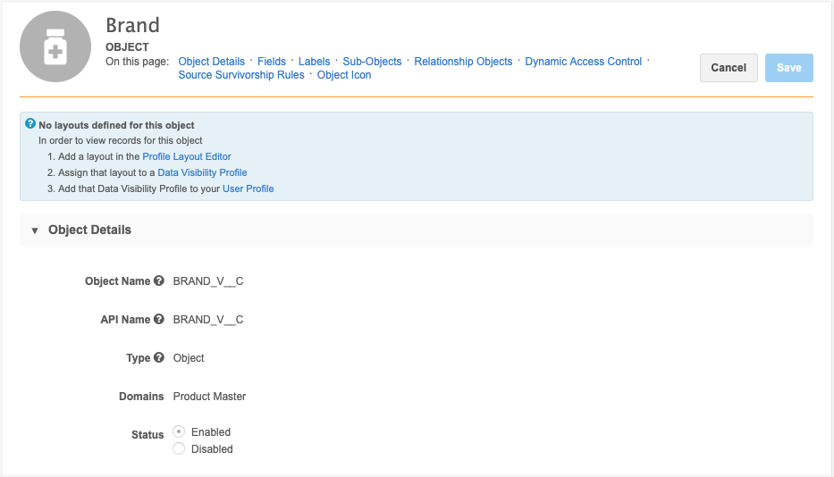 Save the new custom object. When the object is saved, it is automatically associated with the current domain. Custom objects are saved as disabled. You can enable the custom object when you are ready to use it.