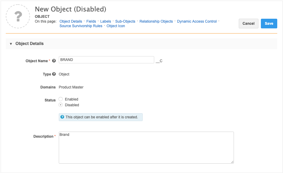 - Status - New custom objects are saved as Disabled. You can enable the object after it is saved.