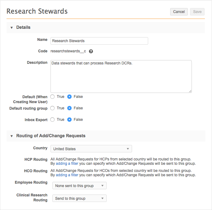 To support add and change requests, configure the inbox task groups to ensure the DCRs are sent to the appropriate data stewards. This is useful if you have data stewards with specific knowledge for custom objects. If an inbox task group is not defined for the custom object, DCRs are sent to your default routing group. Only data stewards and data managers who have permission to the custom object through their data visibility profile can access the DCRs in the inbox.