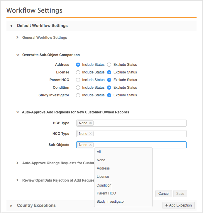 Custom sub-objects can be associated to Veeva standard objects (HCOs, HCPs). The Workflow Settings page supports defining the add request behavior for these objects on HCPs and HCOs.