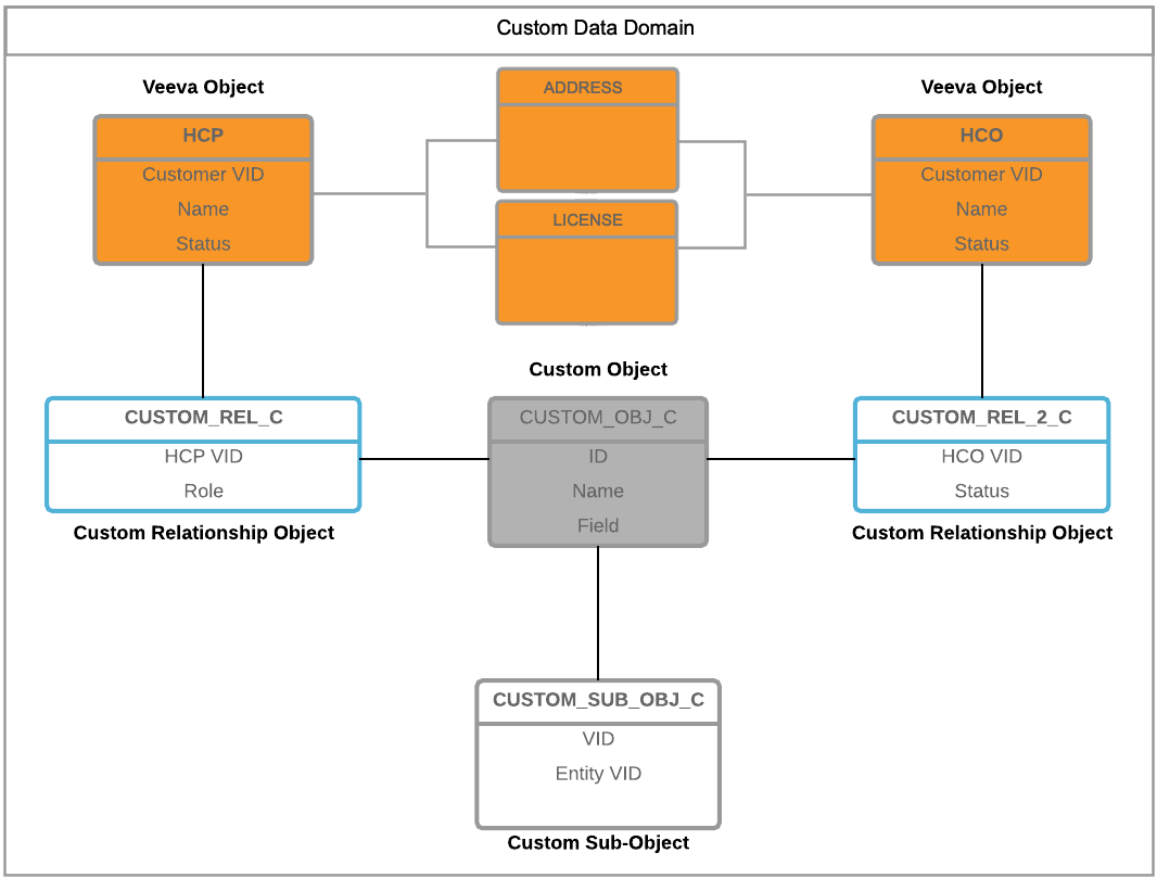 Note: There is no relationship between the STUDY custom object and Veeva's license and address sub-objects. Sub-objects are automatically added to the data domain when the main object (in this example, the HCP or HCO) is added.