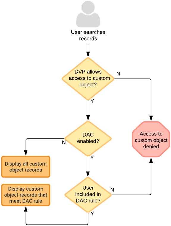 When dynamic access control is enabled for a custom object, no user can access object records until rules are created and assigned to user groups or individual users. If the rule conditions are met and users have access to the custom object through their data visibility profile, they will have access to the custom object records that meet the rule criteria. For custom objects, DVP access is either all access or no access.