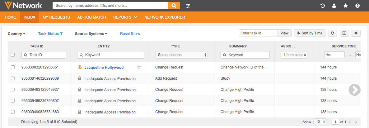 Inbox - Data stewards that do not have access to a custom object can view tasks in their inbox if they belong to an inbox task group that has access to the custom object. The data in Entity column is masked with "Inadequate Access Permission". Clicking the task opens the locked page.
