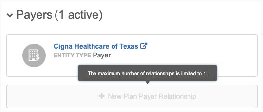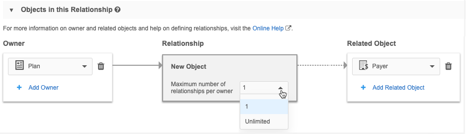 When you create a custom relationship object for payer and plan main objects, set the Maximum number of relationships per owner setting to 1.