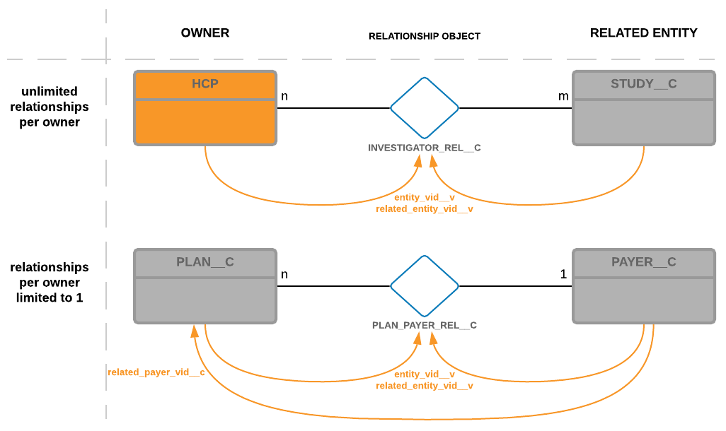 If more than one relationship exists with the same combination of owner and related object, the field name on the owner is incremented with a counter; for example, related_payer_vid__c and related_payer2_vid__c.