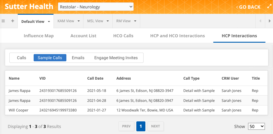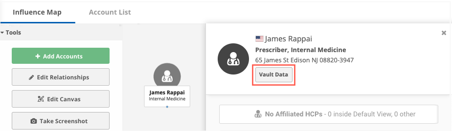 Using tabs on the Influence Map, you can view data components that display data for multiple accounts. For example, you can see emails sent to all HCPs from Veeva CRM or view recent calls for all HCPs.