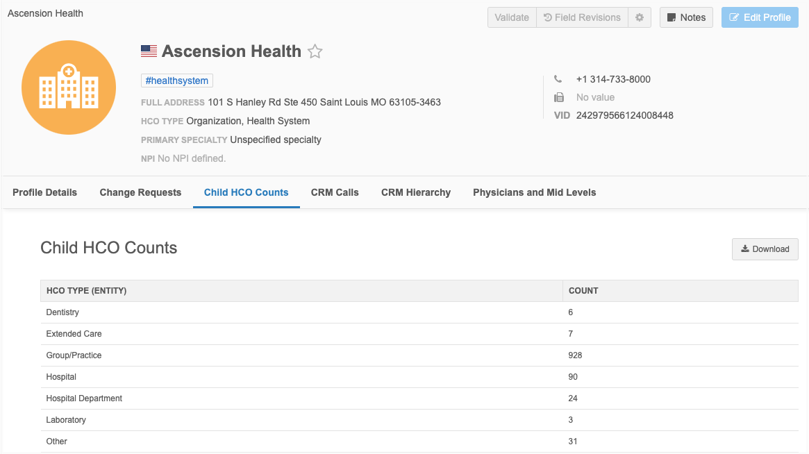 Data components display in tabs at the top of record profiles. They are listed alphabetically after the Profile Information tab. The order cannot be changed. The tabs do not display if data components have not been applied to this widget or do not apply to the profile. For example, if a data component applies to HCPs only, it does not display on HCO accounts.