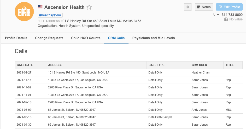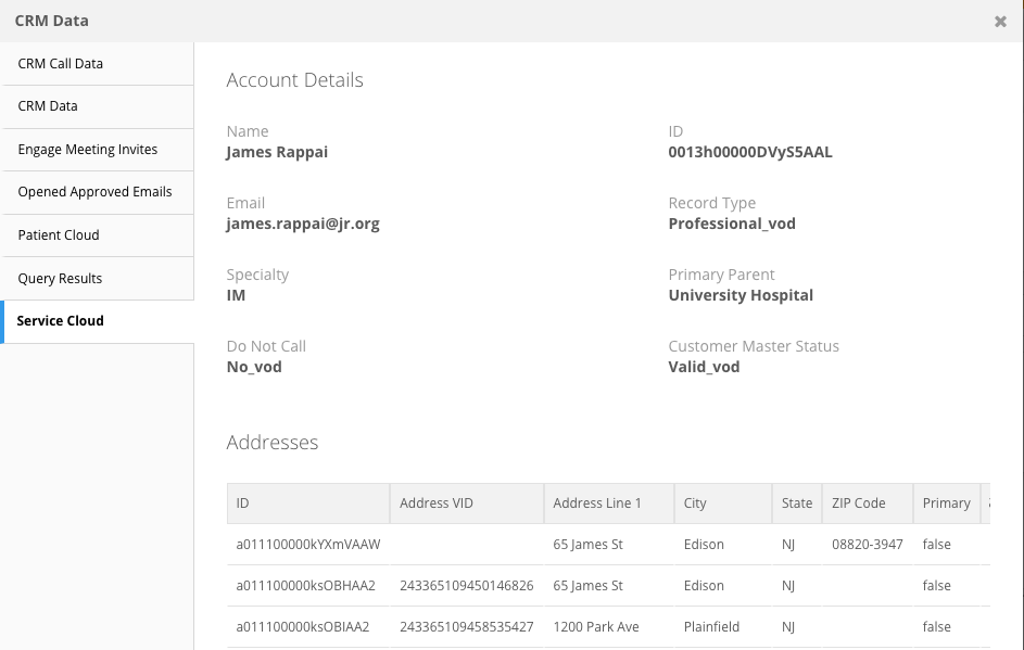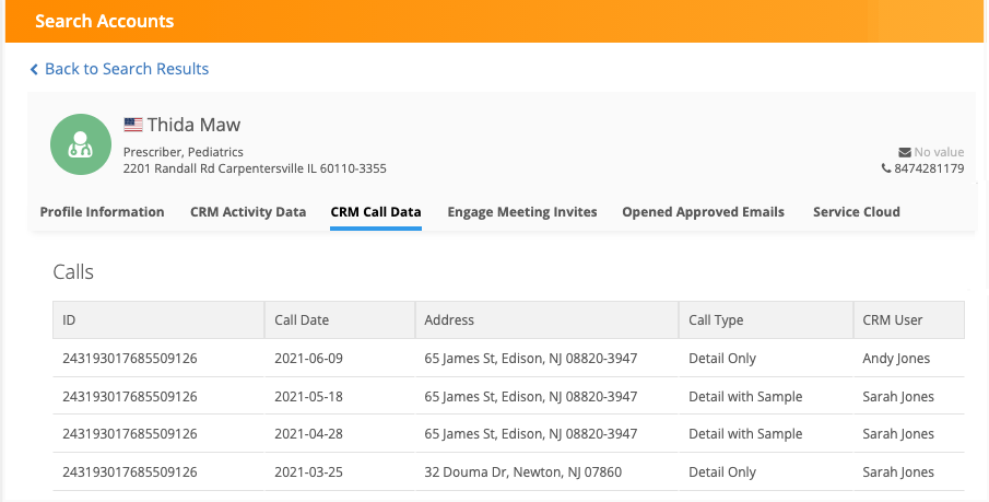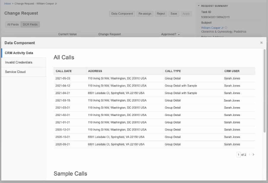 A change request is submitted by a sales rep, Sarah Jones, to change the primary address for an HCP. When she submitted the request, Sarah added a comment that she's been visiting the HCP at a new address recently. To validate this change, the data steward can open the data component to see the latest call data on the HCP's CRM account.