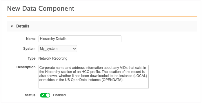 Administrators can create a data component so users can quickly access additional information about the related hierarchy Veeva IDs directly from the HCO record.