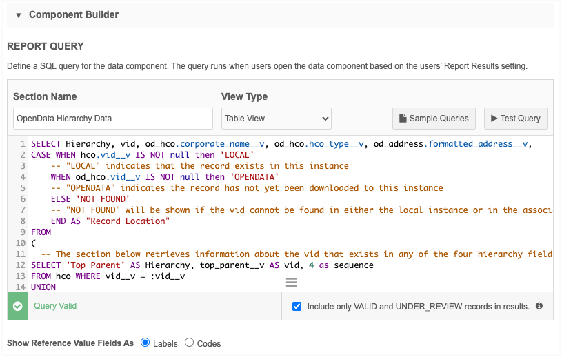 SELECT Hierarchy, vid, corporate_name__v, hco_type__v, address.formatted_address__v, CASE WHEN hco.vid__v IS NOT NULL THEN 'LOCAL' -- "LOCAL" indicates that the record exists in this instance ELSE 'NOT FOUND' -- "NOT FOUND" will be shown if the vid cannot be found in the local instance. It could reside in the OpenData instance or not exist. END AS "Record Location" FROM ( SELECT 'Top Parent' AS Hierarchy, top_parent__v AS vid, 4 AS sequence FROM hco WHERE vid__v = :vid__v UNION SELECT 'Regional Health System' AS Hierarchy, regional_health_system__v AS vid, 3 AS sequence FROM hco WHERE vid__v = :vid__v UNION SELECT 'Hospital Parent' AS Hierarchy, hospital_parent__v AS vid, 2 AS sequence FROM hco WHERE vid__v = :vid__v UNION SELECT 'Immediate Parent' AS Hierarchy, immediate_parent__v, 1 AS sequence FROM hco WHERE vid__v = :vid__v ) parent LEFT JOIN hco ON parent.vid = hco.vid__v AND hco.record_state__v = 'VALID' LEFT JOIN address ON address.entity_vid__v = parent.vid AND address_ordinal__v = 1 AND address_status__v = 'A' WHERE vid IS NOT NULL ORDER BY sequence ; - Select Include only VALID and UNDER_REVIEW records in results.