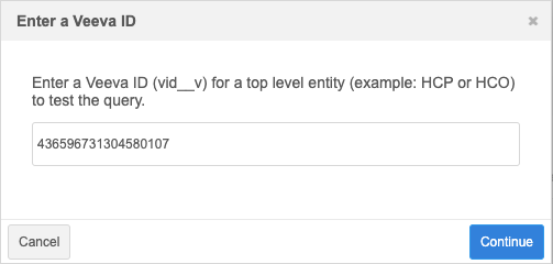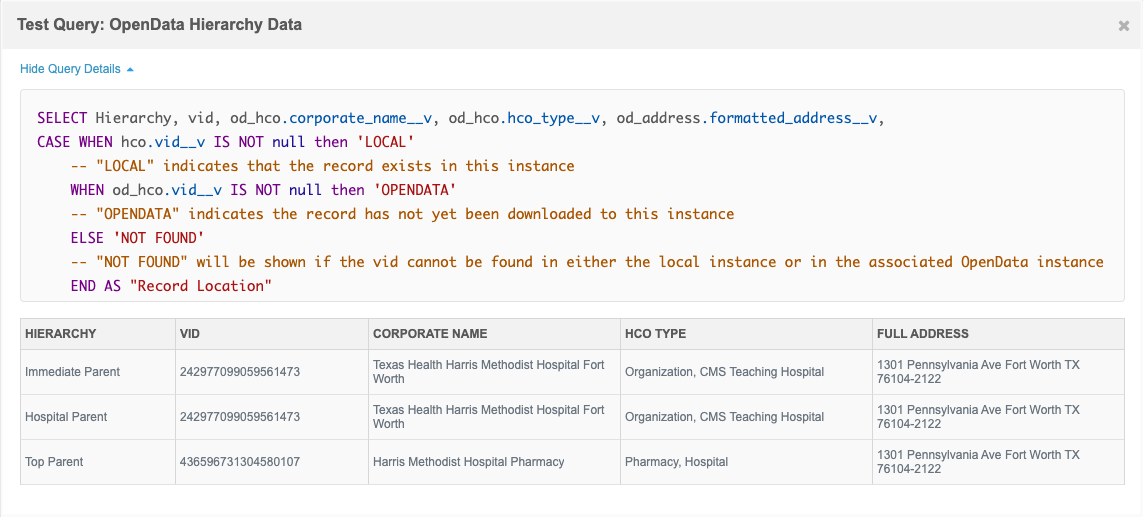 SELECT Hierarchy, vid, od_hco.corporate_name__v, od_hco.hco_type__v, od_address.formatted_address__v, CASE WHEN hco.vid__v IS NOT NULL THEN 'LOCAL' -- "LOCAL" indicates that the record exists in this instance WHEN od_hco.vid__v IS NOT NULL THEN 'OPENDATA' -- "OPENDATA" indicates the record has not yet been downloaded to this instance ELSE 'NOT FOUND' -- "NOT FOUND" will be shown if the vid cannot be found in either the local instance or in the associated OpenData instance END AS "Record Location" FROM ( -- The section below retrieves information about the vid that exists in any of the four hierarchy fields. The order of these four fields is fixed. A field will not display if it is empty. SELECT 'Top Parent' AS Hierarchy, top_parent__v AS vid, 4 AS sequence FROM hco WHERE vid__v = :vid__v UNION SELECT 'Regional Health System' AS Hierarchy, regional_health_system__v AS vid, 3 AS sequence FROM hco WHERE vid__v = :vid__v UNION SELECT 'Hospital Parent' AS Hierarchy, hospital_parent__v AS vid, 2 AS sequence FROM hco WHERE vid__v = :vid__v UNION SELECT 'Immediate Parent' AS Hierarchy, immediate_parent__v AS vid, 1 AS sequence FROM hco WHERE vid__v = :vid__v ) parent -- The query only returns information for valid HCO records. LEFT JOIN hco ON parent.vid = hco.vid__v AND hco.record_state__v = 'VALID' LEFT JOIN opendata_na.hco od_hco ON parent.vid = od_hco.vid__v AND od_hco.record_State__v = 'VALID' -- The address information shown is for an active address with an ordinal value of 1. LEFT JOIN opendata_na.address od_address ON parent.vid = od_address.entity_vid__v AND od_address.address_ordinal__v = 1 AND od_address.address_status__v = 'A' WHERE vid IS NOT NULL ORDER BY sequence ;Query - Pay Per Record (PPR) subscriptions