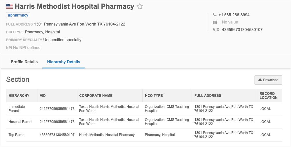 OpenData HCO records (US only) include a Hierarchy section that contains the Veeva IDs of specific related HCOs.