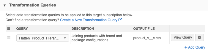This section identifies any transformation queries that are applied to the target subscription from a transformation query configuration page (System Interfaces > Transformation Queries) . The queries will transform the data within Network before exporting it in the target subscription.