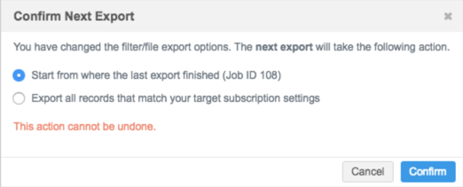 The Confirm Next Export dialog displays any time changes are made to the filters for a target subscription. If the target subscription filters are not changed, the delta of records from the last job that ran will be exported, as usual.