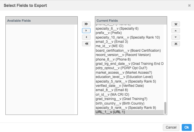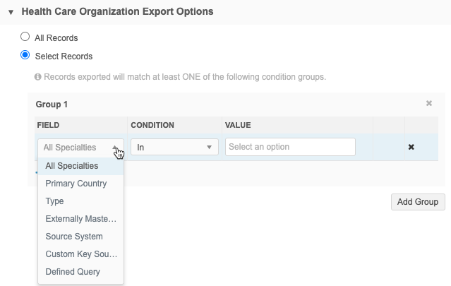 - All Specialties - Use to define the specific specialties for HCPs or HCOs to export. The set of specialty fields are queried for the value that you define.