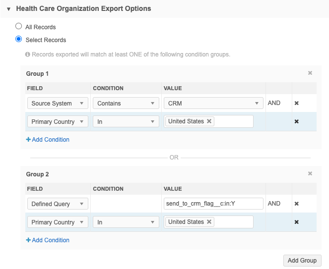 - Set a flag (for example, Send to CRM) so that the parent HCO records with a Send to CRM flag are exported.