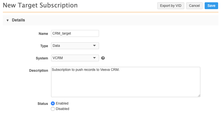 The Details section of the target subscription defines the type of data for export, either data or DCR, and basic information for the subscription.