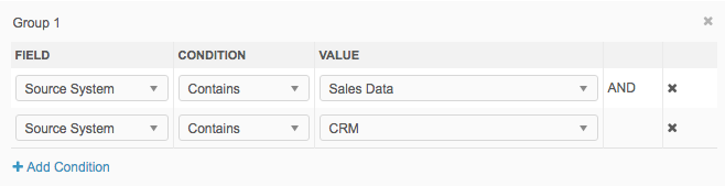 When the filter is complete you can add another condition, click Add Condition again, or click Add New Group to create another group of conditions. Multiple groups of conditions are separated by an OR condition.