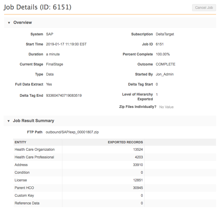 After a target subscription job has run, details about the records that were exported are available on the Job Details page.