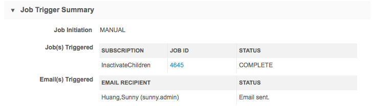 If subsequent jobs or emails were triggered by this job, the details displays beside those headings.