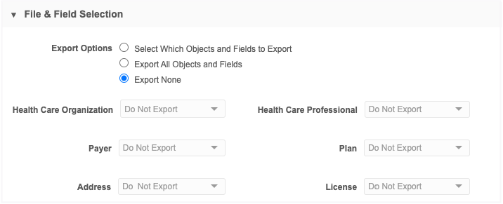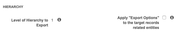 The Hierarchy section indicates that one level of parent will be exported to ensure that relationships are intact. One parent is exported, even if it does not meet the criteria you set in the Export Options section for that object. For example, if you want to export only HCPs that are prescribers and HCOs that are Dialysis Centers, if a prescriber has an HCO parent that is a Hospital, the Hospital will be included in the export.