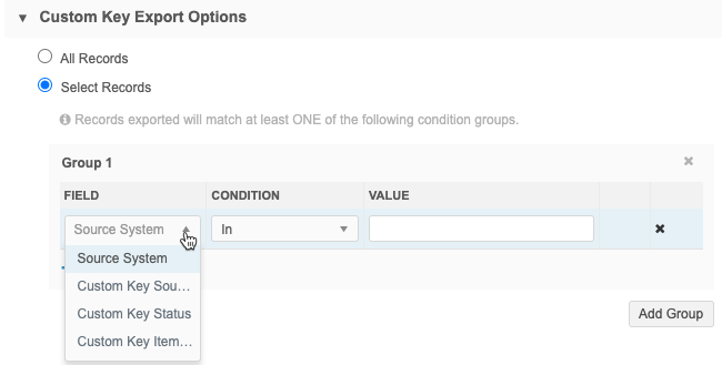 Custom Key Source - Records that match the source defined in the custom key are exported. For example, SAP is the source in this custom key: SAP:HCP:4778349.