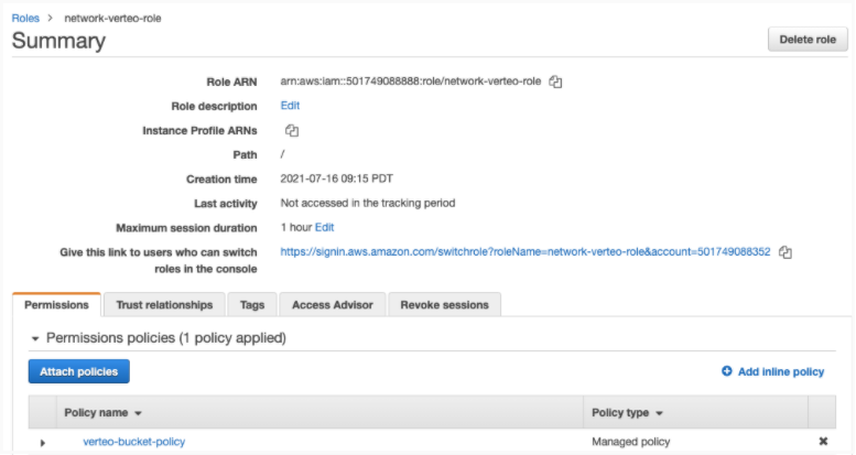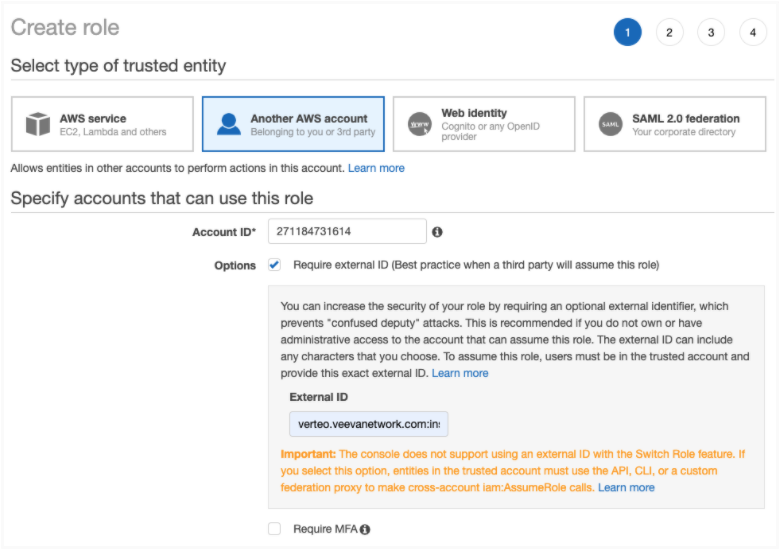 { "Effect": "Allow", "Principal": { "AWS": "arn:aws:iam::271184731614:root" }, "Action": "sts:AssumeRole", "Condition": { "StringEquals": { "sts:ExternalId": "verteo.veevanetwork.com:instance_307" } } }If you use Amazon's IAM role setup, the following settings are required: