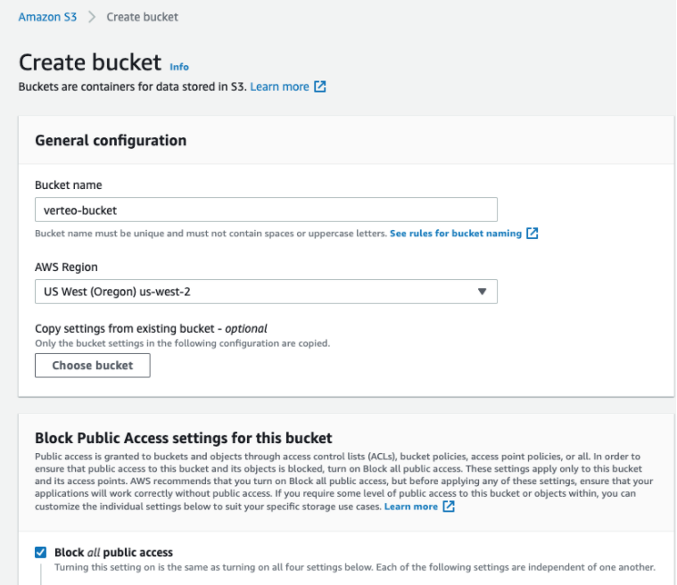 On the Create bucket page, type a Bucket name, choose the AWS Region and ensure that Block all public access is selected.