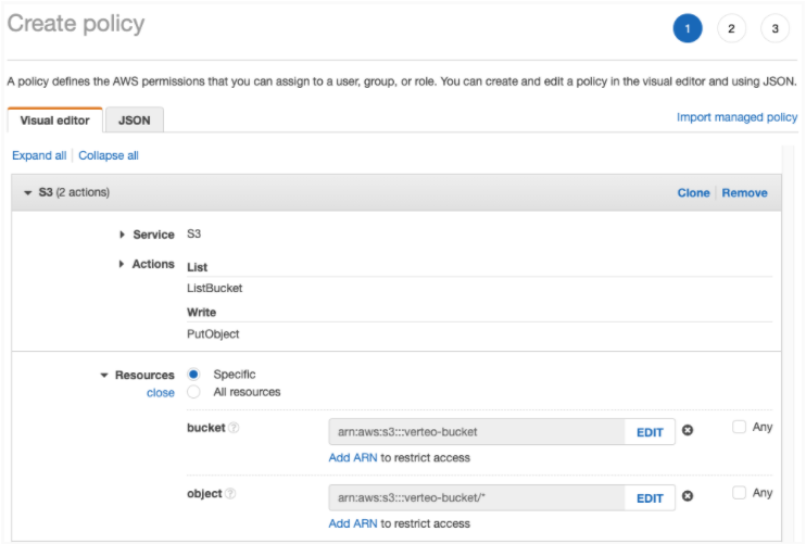 { "Version": "2020-09-01", "Statement": [ { "Effect": "Allow", "Action": [ "s3:PutObject", "s3:ListBucket" ], "Resource": [ "arn:aws:s3:::verteo-bucket/*", "arn:aws:s3:::verteo-bucket" ] } ] } -