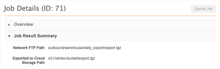 After you run the source subscription, the Job Details page includes the export path in the Job Result Summary section.