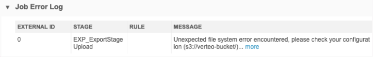 If there was a problem exporting to the cloud storage, the following error will be reported in the Job Error Log on the Job Details page:
