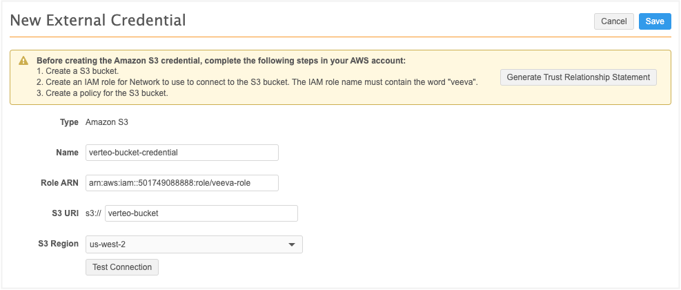 Click Test Connection. Network validates the credentials and ensures that the S3 bucket exists.