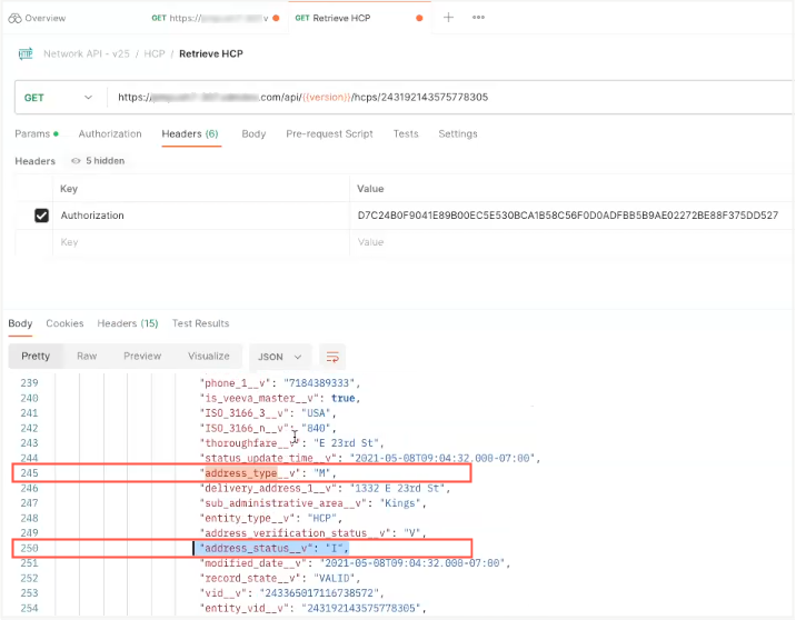 The specialty_1__v field value is NULL, so it is not returned in the Retrieve HCP response. A transformation rule runs that changes the NULL value to "UNSPECIFIED__c". Now, the Specialty field will be returned in the JSON: "specialty_1__v":"UNSPECIFIED__c".