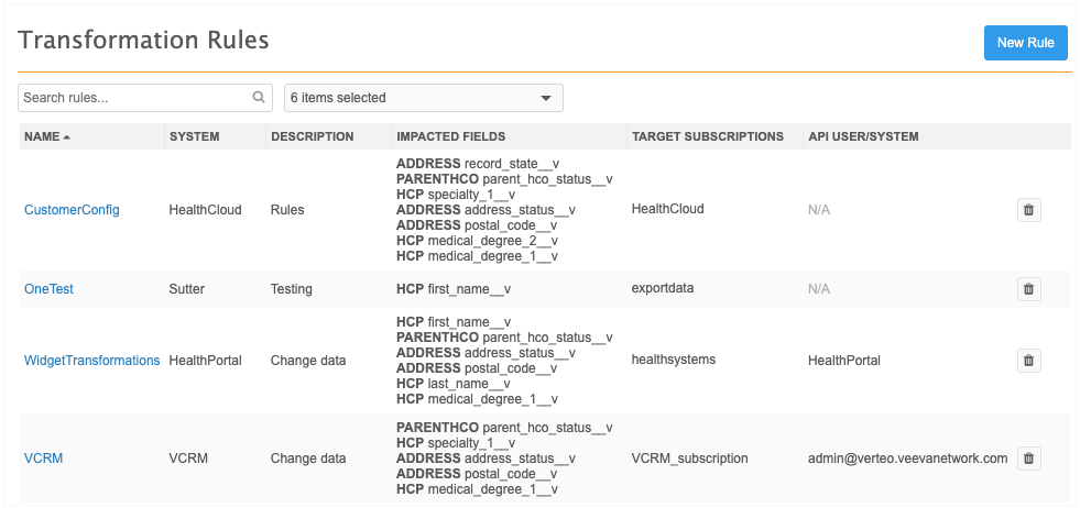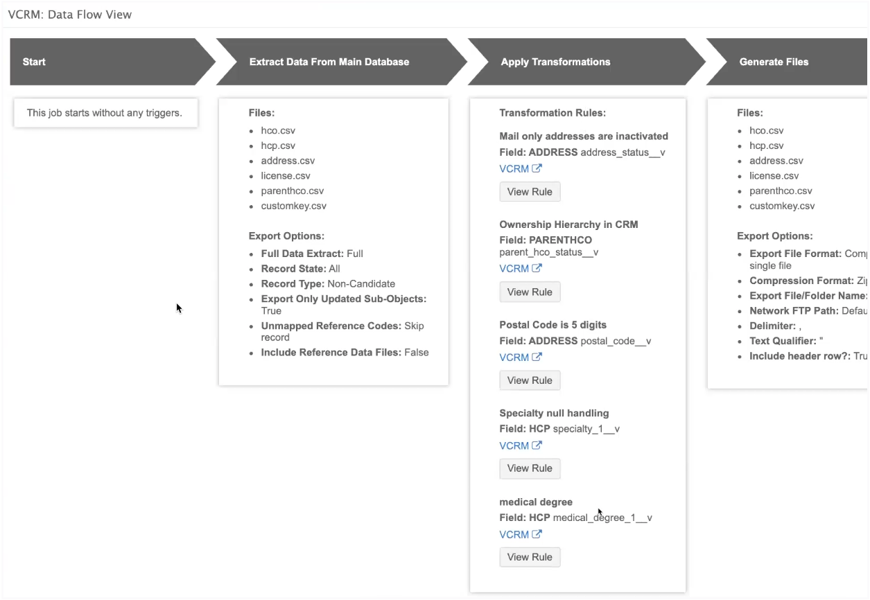 Administrators can create rules to transform field values in the APIs and in export files for downstream systems. You can also use transformation rules to override OpenData values before records are pushed to Veeva CRM.