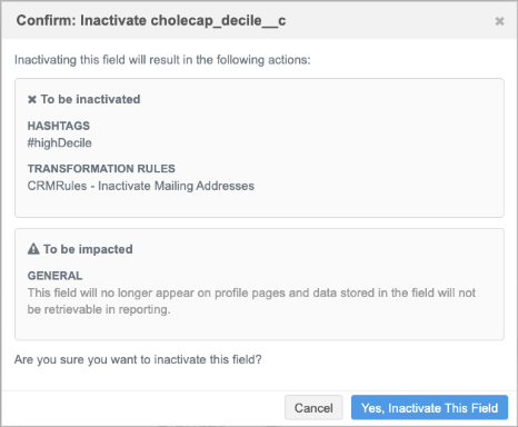 Before a field is deactivated, a dialog notifies you that transformation rules that use the field will be deactivated.