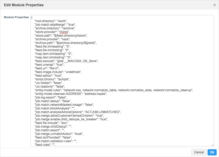 You can click Advanced at the top of the subscription page to edit detailed settings in the Edit Module Properties dialog. This dialog contains, at a minimum, the required settings from the subscription, and default values for settings that haven't been specified.