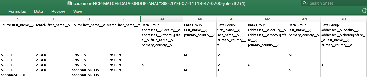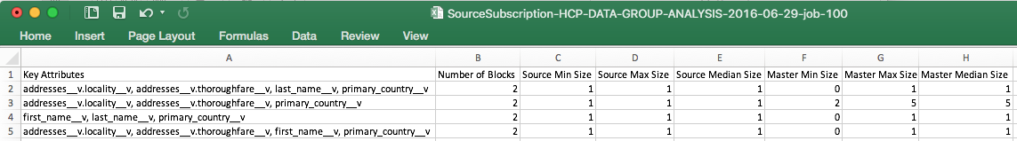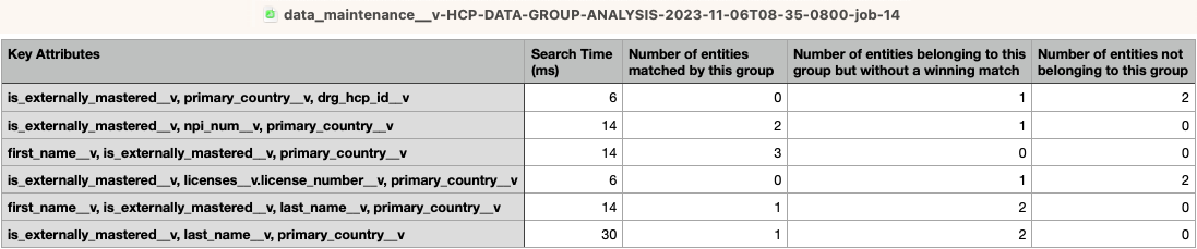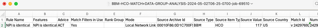 When the job runs, the match analysis is exported to a .csv file; for example, the HCO file name is <subscription_name>HCO-MATCH+DATA-GROUP-ANALYSIS-<date>-job-xxx.csv.