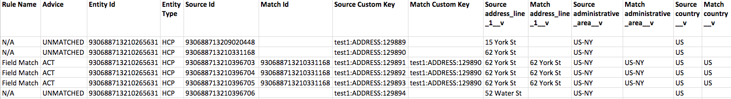 - Address 1 and 2 matched using key match because the custom keys are identical. In the match log, one entry displays. The Advice column displays UNMATCHED because the record did not match an existing record in Network. A new address record is created in Network.