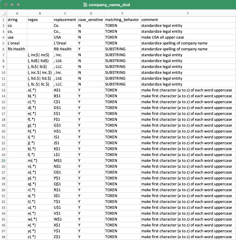 This data cleansing dictionary, company_name_dcd, contains rules to standardize a field called Company Name. It has rules for specific company names (for example, L'Oreal and RB Health) but it also has rules to standardize capitalization and legal entities for all company names.