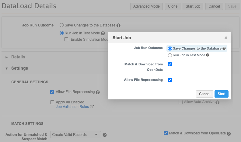 If fuzzy match is not enabled for the subscription (in Advanced Mode, the property job.match.fuzzyMatch is set to false) but Match & Download from OpenData is enabled, the following behavior occurs: