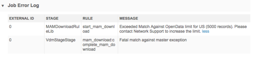 If you buy OpenData per record in that country and the job tries to download more than 5000 matched records, the job will fail; no records will be created or updated in your Network instance. The Job Error Log advises that the number of matched records exceeds the limit of records that can be downloaded for the country.