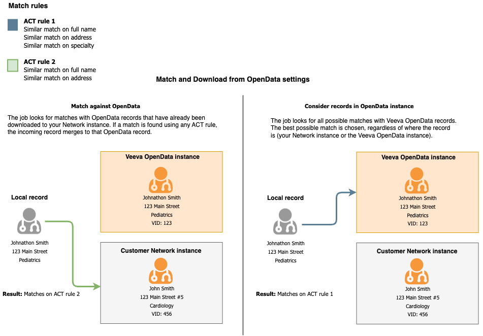 When you enable these settings, the match process first looks for matches to OpenData records that exist in your Network instance. If a match is found using any of the ACT match rules, the incoming record will be merged into that Veeva OpenData record.