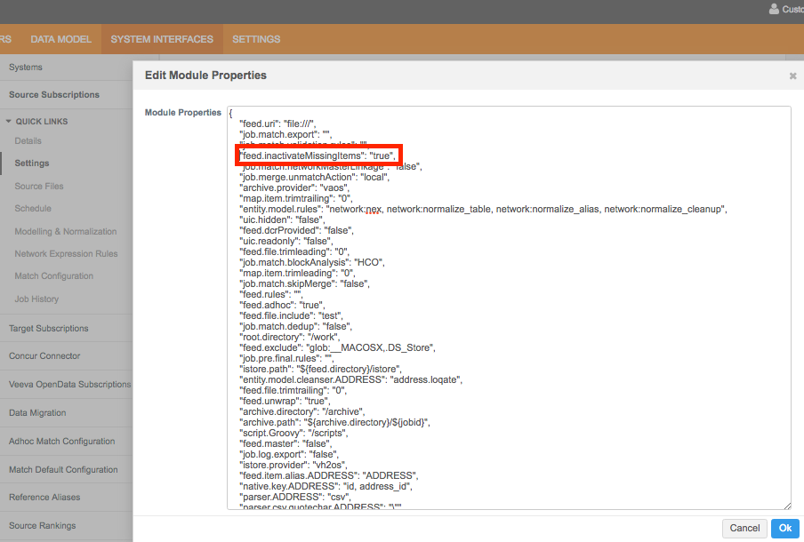 feed.inactivateMissingItemsand set the value to true.The property value is false, by default. When set to true, the data load assumes that source feeds contain all records. Network will identify the records that are missing, but were previously loaded, and source deactivate the custom keys for missing records.