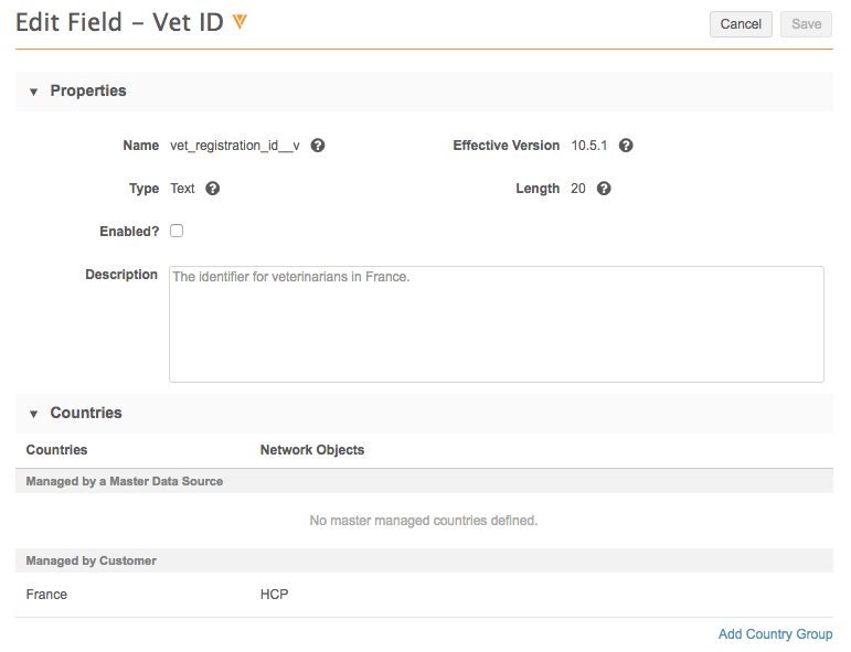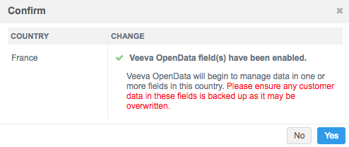 If the field has been used for locally managed data in this country, back up your data because it will be overwritten when you receive updates from Veeva OpenData.