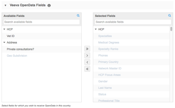Available Fields - Fields in this column are new to Veeva OpenData for this country but have been available to use in the Network data model. It is possible that the fields are being used for customer-owned data, so you must explicitly select the field to add it to the Selected Fields column so that Veeva OpenData can manage the data.